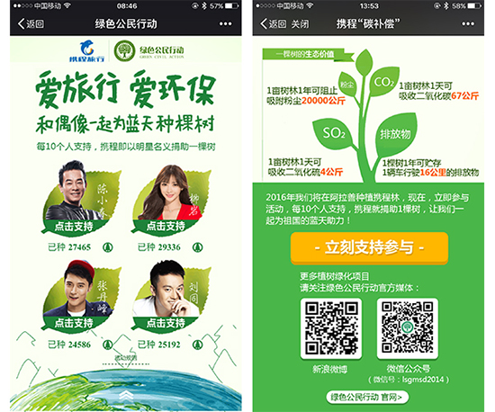 活动的目的是希望借助艺人的号召力,呼吁社会关注中国绿化事业。明星们会通过微、微信等渠道为自己拉票,大力宣传绿色低碳理念。明星粉丝可以通过活动专属的H5互动页面选择支持自己喜欢的明星,明星每获得10个人的支持,携程旅行网就会向bt365投注——绿色公民行动捐助1棵树。活动得到了广泛的社会关注,陈小春、柳岩、刘同等明星的微博先后转发,让活动达到高潮,短短5天内,新浪微博“爱环保、爱旅行”的话题累计阅读量889万人次。