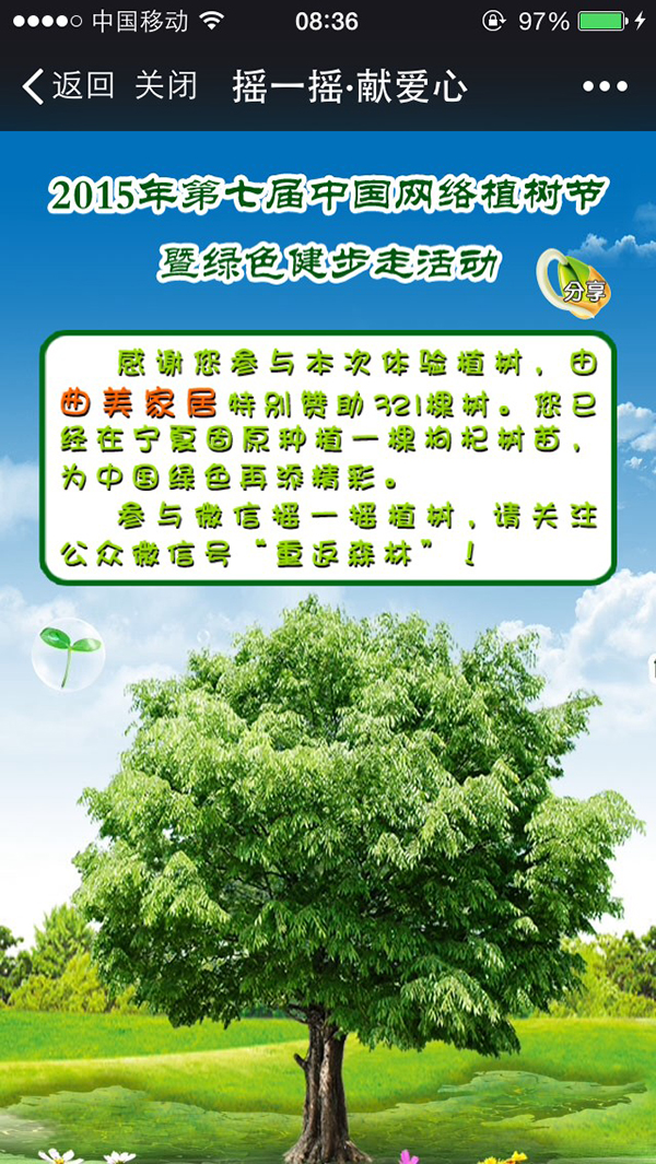 此次活动得到爱心企业曲美家居和新浪微公益的独家战略支持。活动现场,主持人邀请现场的领导、嘉宾与媒体记者一起扫描二维码,通过微信摇一摇和新浪微博拍照发布的方式,现场在线共植321棵枸杞树。