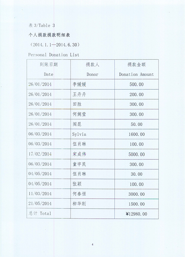 2014年1月1日至2014年6月30日捐款