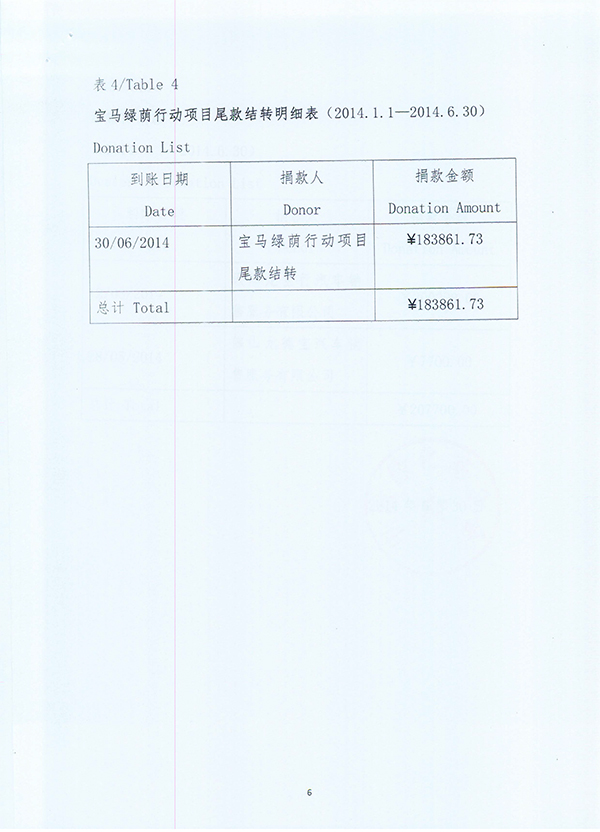 宝马绿荫行动项目尾款结转明细表(2014.1.1—2014.6.30)